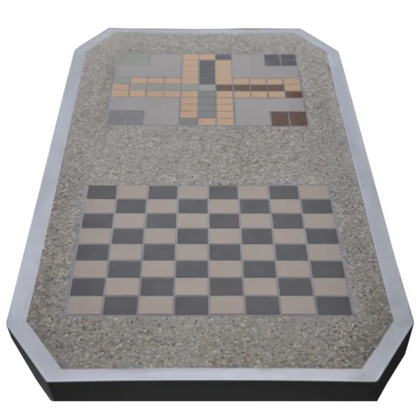Nowy wymiar trwałości i estetyki. Model 77511B to kompletna strefa gier dla wymagających inwestycji. Kluczową cechą tego zestawu jest blat wykonany w technologii hybrydowej: płytki gresowe (plansze do gier) są wtopione bezpośrednio w strukturę betonu, a następnie cała powierzchnia jest szlifowana. Efektem jest idealnie gładki monolit, który eliminuje ryzyko odklejania się płytek i zapewnia najwyższy komfort gry. Przy wadze blisko 1000 kg, zestaw ten jest synonimem stabilności i odporności na wandalizm.
