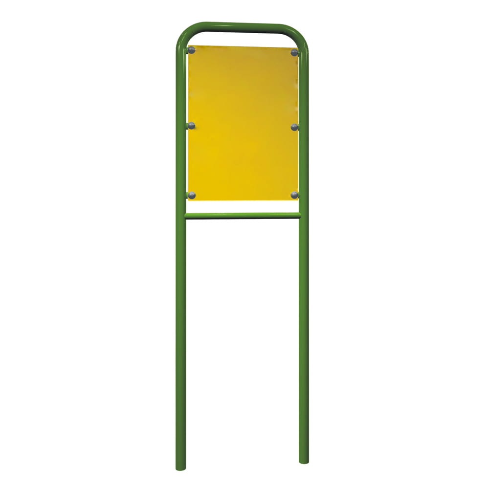 Tablica informacyjna Mała z nadrukiem Dane techniczne: wysokość 250 cm szerokość 61 cm konstrukcja z rury stalowej o średnicy 48,3 mm i 30 mm elementy stalowe ocynkowane i malowane proszkowo nadruk klejony na blachę stalową dodatkowo laminowany tablica standardowo malowana proszkowo na czarno, istnieje możliwość wybrania innego koloru z palety RAL. Montaż: poprzez zabetonowanie